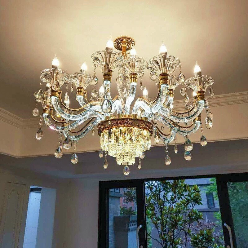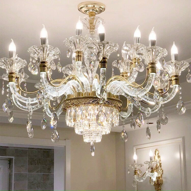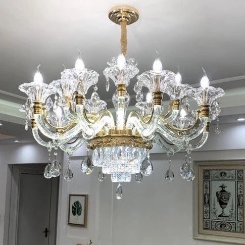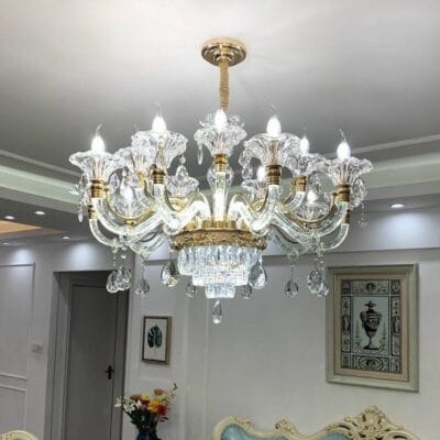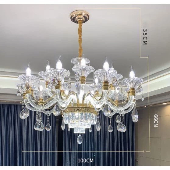 • Pha lê: Pha lê cao cấp (thường là K9, đảm bảo độ trong suốt và khả năng tán sắc ánh sáng). Các chi tiết pha lê có thể được tích hợp dưới dạng hạt, giọt, hoặc thanh.